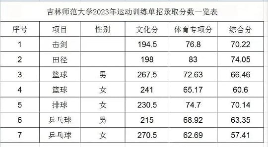 1.文化成绩录取控制线180分。击剑、田径和篮球专项成绩录取控制线65分,乒乓球和羽毛球专项成绩录取控制线40分。
